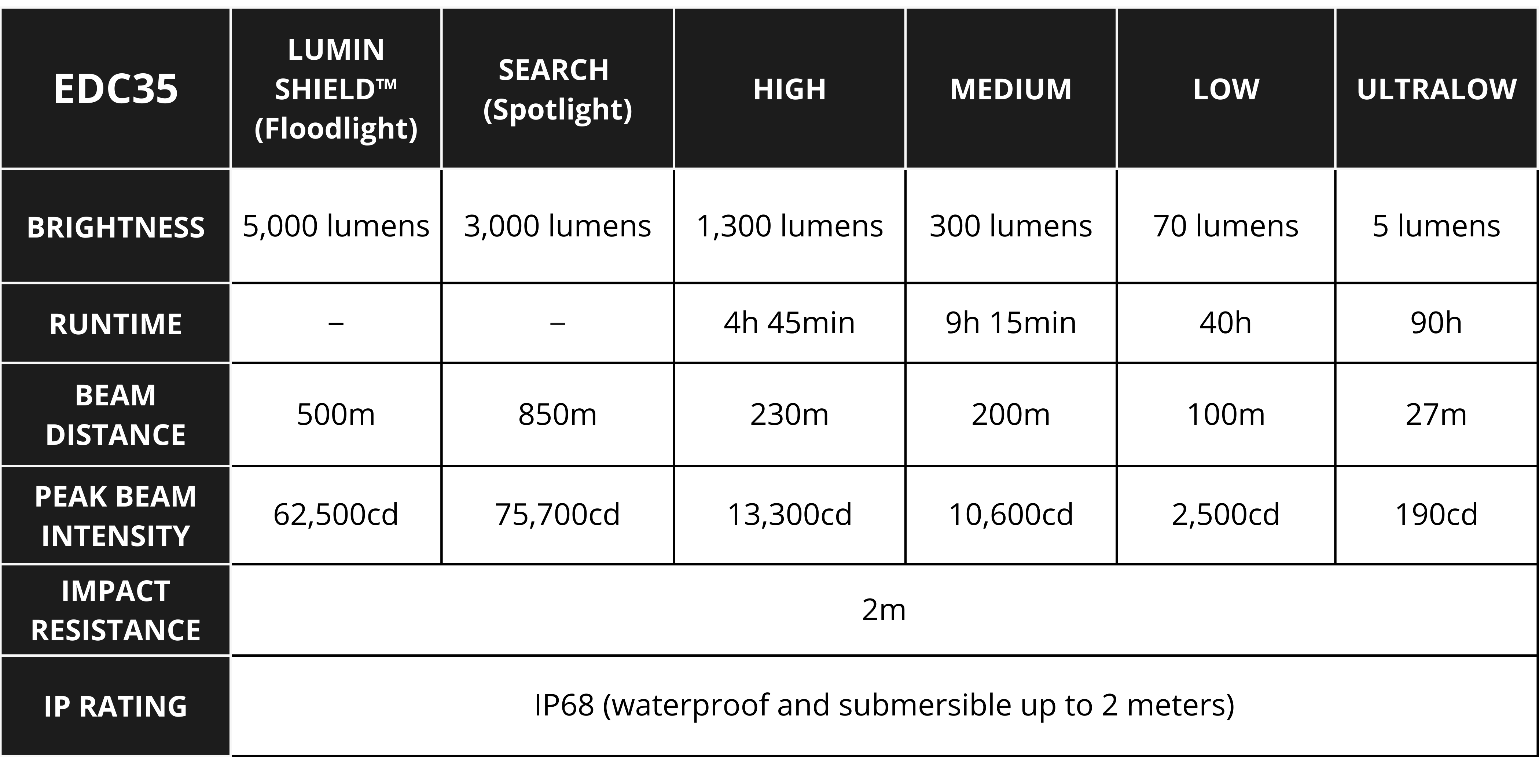 EDC35 is a compact, high-performance flashlight for everyday carry and tactical use. Its NiteLab UHi 40 MAX LED delivers up to 5,000 lumens and up to 550 m beam distance, with 4 brightness levels plus SEARCH and LUMIN SHIELD™ modes for fast output changes.