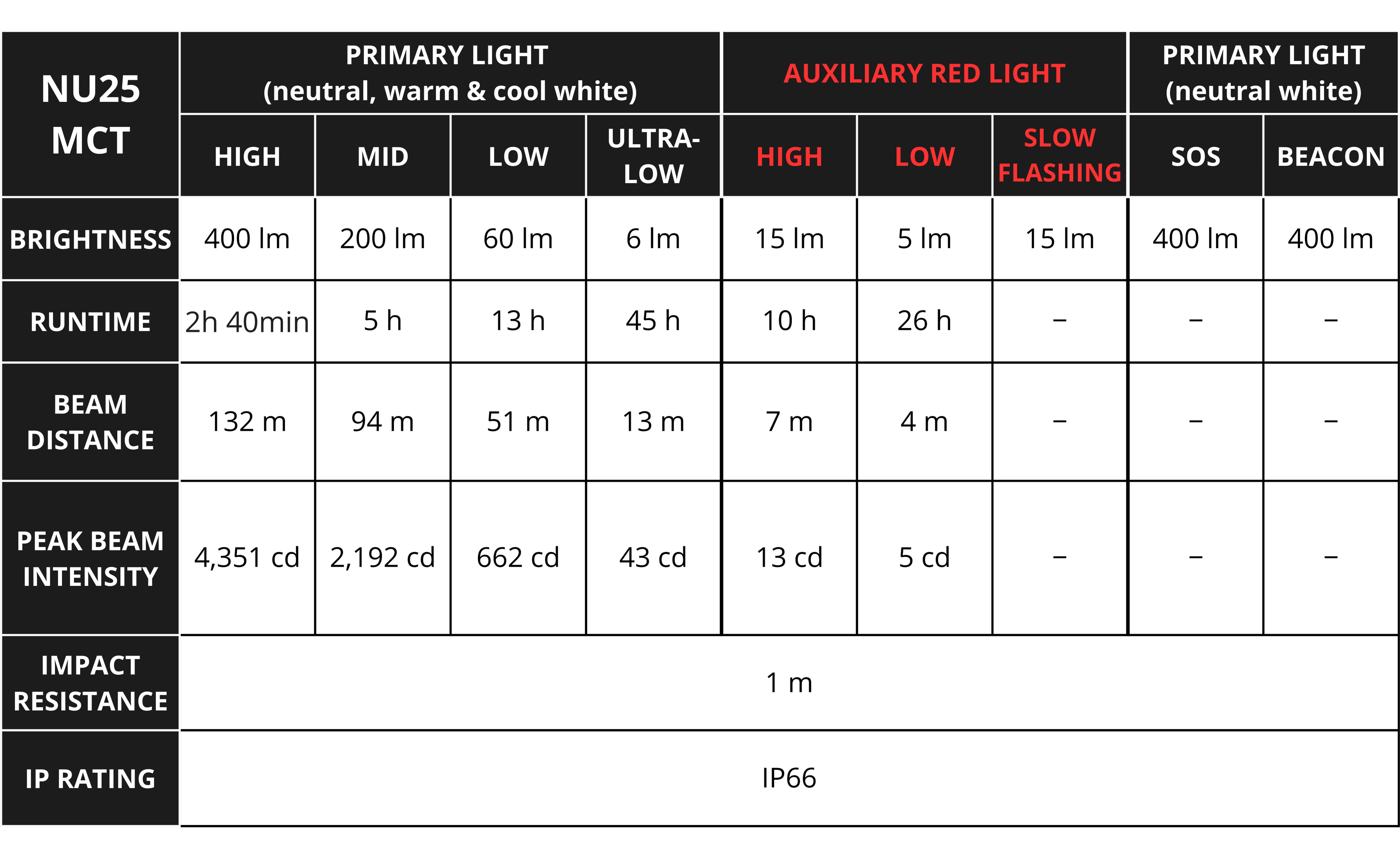 NU25 MCT is an ultra-lightweight headlamp designed for outdoor activities where low weight, efficient lighting and long runtime matter. It delivers up to 400 lumens using NiteLab MCT UHE LEDs with three selectable color temperatures, allowing the user to adapt the light to different conditions such as trail navigation, campsite tasks or close-range work.