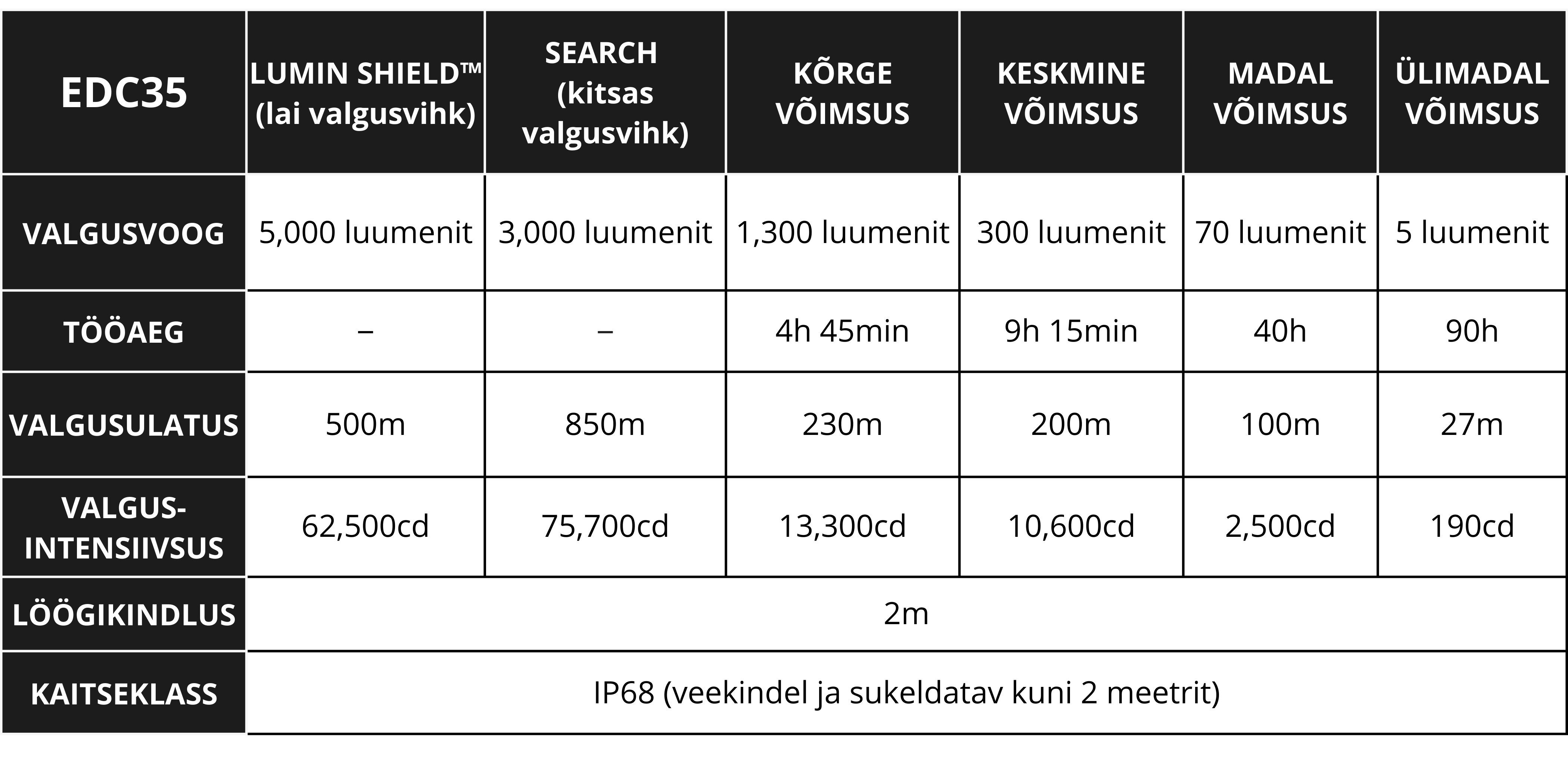 EDC35 on kompaktne suure jõudlusega taskulamp, mis sobib nii igapäevaseks kasutuseks kui ka taktikalisteks olukordadeks. NiteLab UHi 40 MAX LED annab kuni 5,000 luumenit ja kuni 550 m valgusulatust; 4 eredusastet ning SEARCH- ja LUMIN SHIELD™-režiimid võimaldavad valgust kiiresti vastavalt olukorrale kohandada.