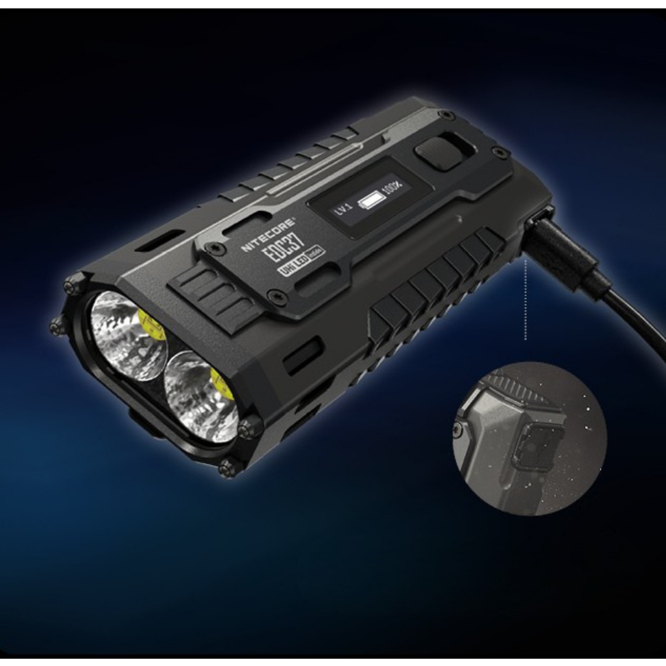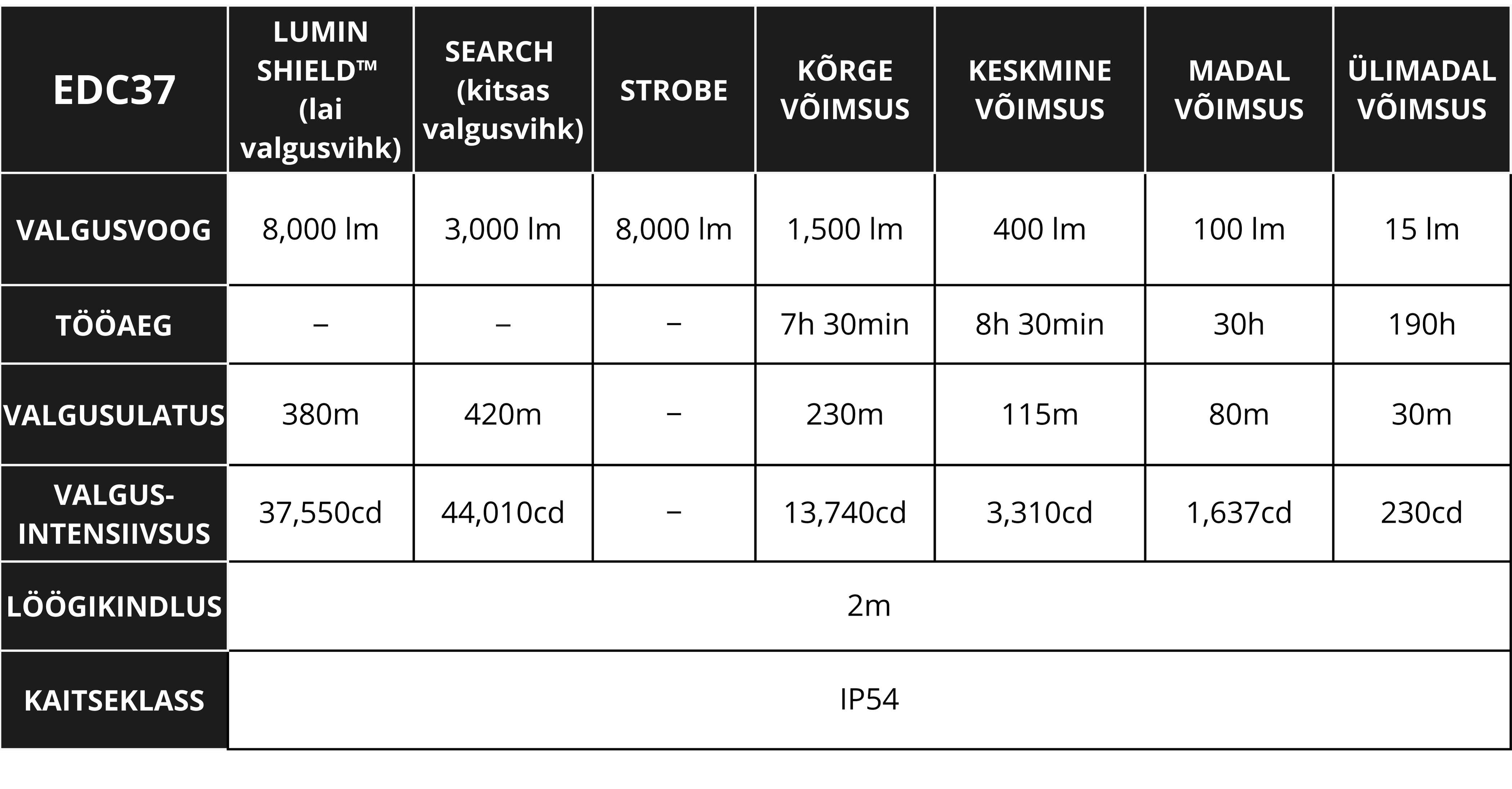 EDC37 on suure jõudlusega EDC-taskulamp kasutajale, kes vajab maksimaalset valgusvõimsust. Kahe UHi 20 MAX LED-i kooslus tagab kuni 8000 luumenit valgusvoogu ning kuni 420 meetrise valgusulatuse, sobides nii laiemate alade valgustamiseks kui ka objektide tuvastamiseks pikemalt distantsilt.