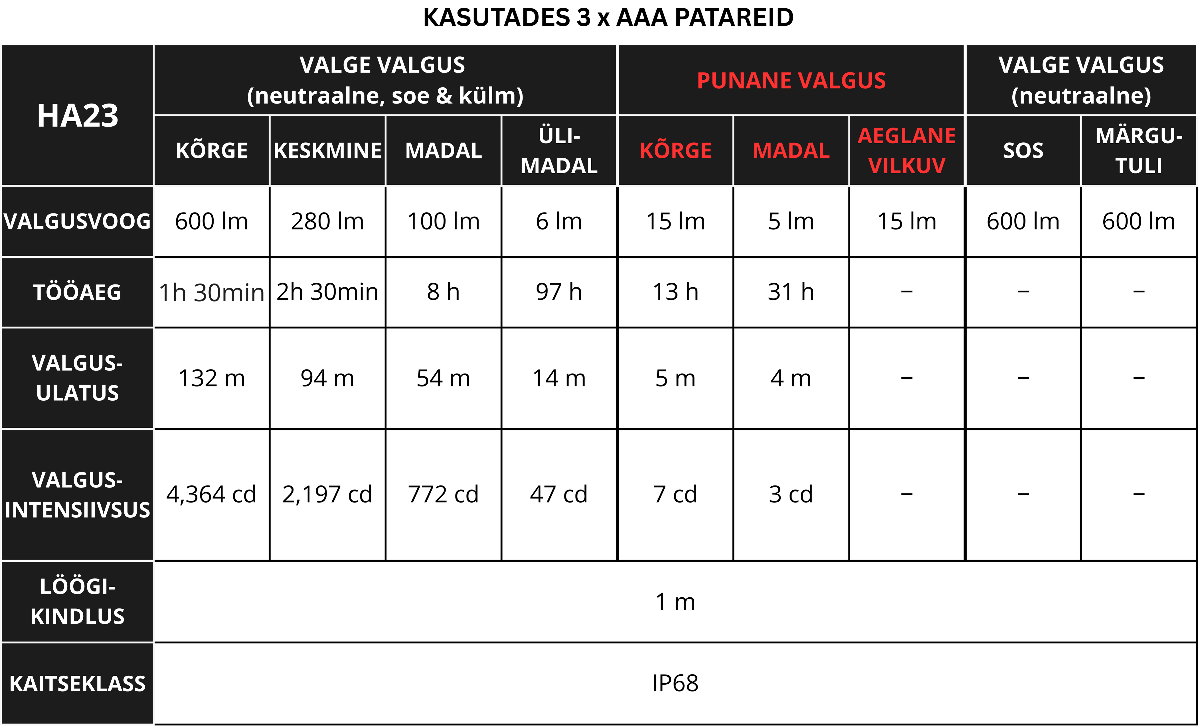 Tugev PC-korpus, IP68 kaitseklass ja kompaktne konstruktsioon aitavad hoida lambi töökindlana ka niisketes ja tolmustes tingimustes. HA23 UHE sobib kasutamiseks nii telkimisel, matkamisel kui ka öisel liikumisel.