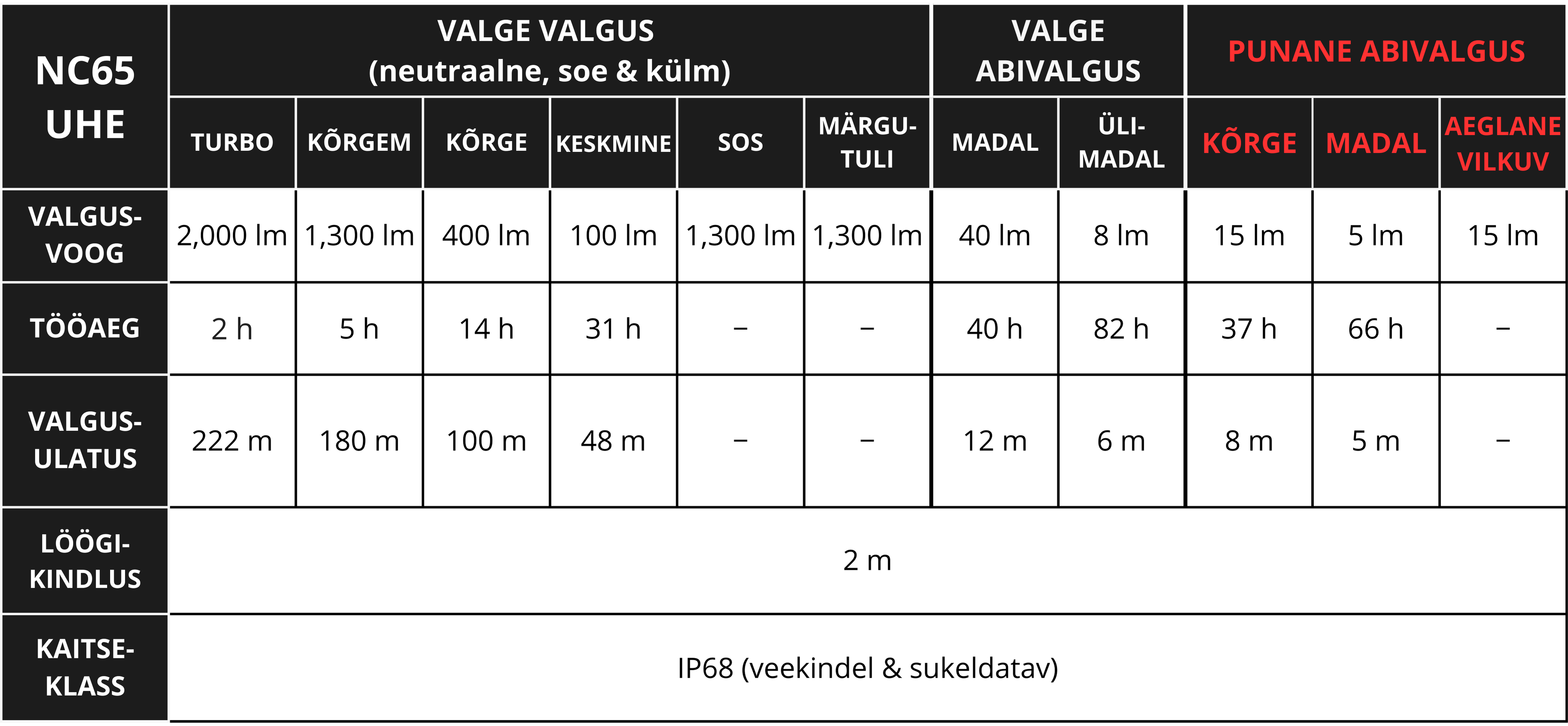HC65 UHE on suure valgusvõimsusega pealamp, mis on loodud kasutamiseks nõudlikes välitingimustes. 8-tuumaline NiteLab UHE LED-süsteem annab kuni 2,000 luumenit valgusvoogu ning valgustab laia ja ühtlase valgusvihuga nii lähedal kui ka kaugemal asuvaid objekte.