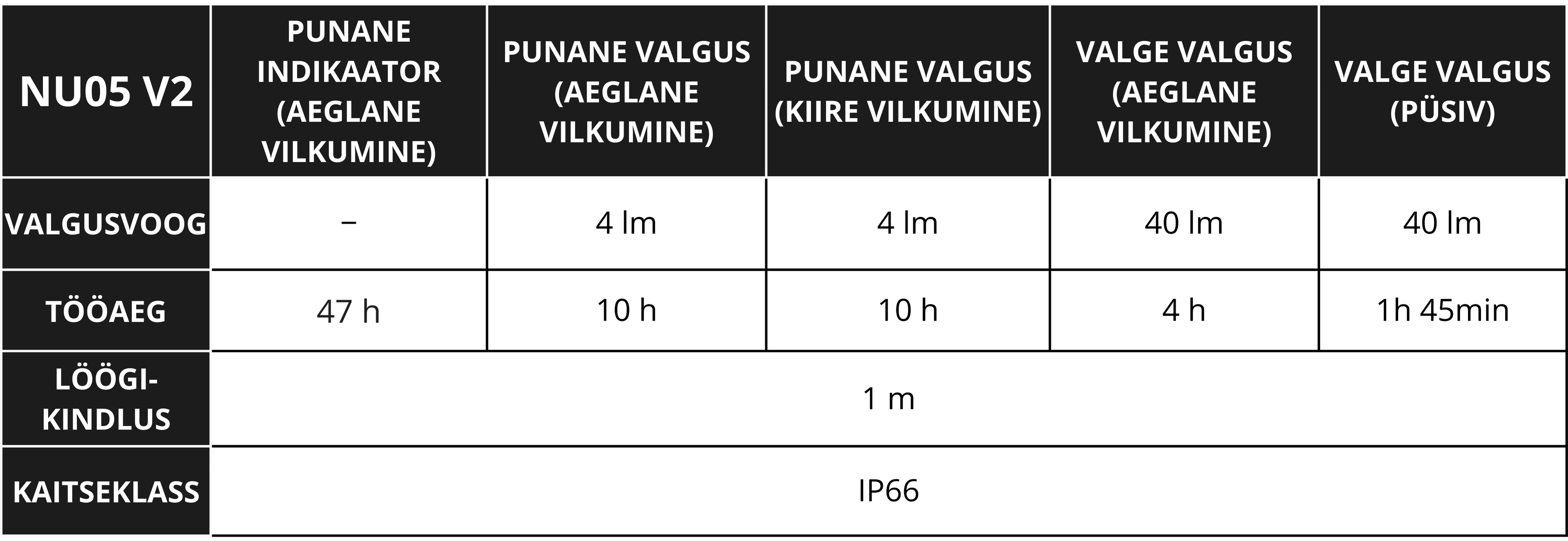 NU05 V2 on ülikerge ja USB-C kaudu laetav nähtavus- ja ohutustuli, mis on mõeldud kasutamiseks hämarates ja pimedates tingimustes. Vaid 11,1 grammi kaaluv seade sobib kandmiseks peapaelal või kinnitamiseks kiivrile, seljakotile, jalgrattale või riietele.