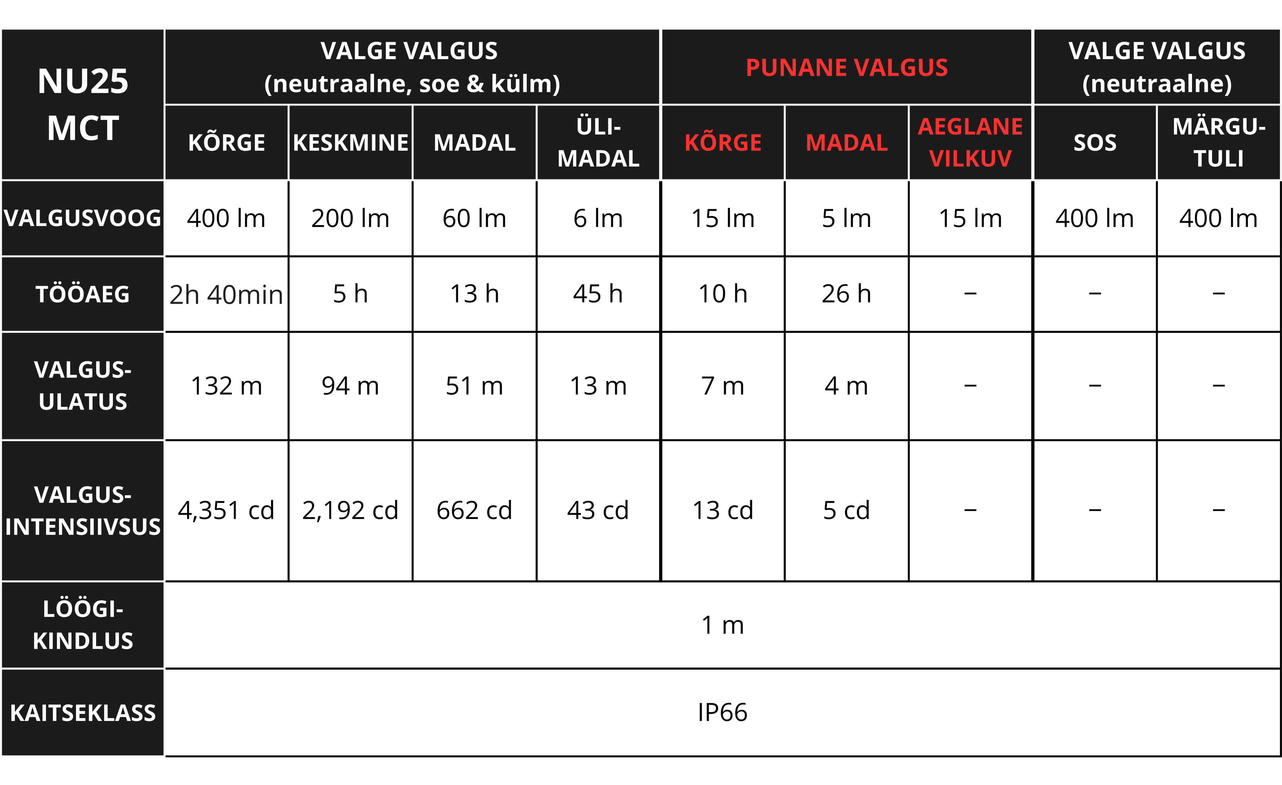 Kerge konstruktsioon, lai ja ühtlane valgusvihk ning kahe nupuga kasutajaliides teevad NU25 MCT-st praktilise valiku matkamiseks, telkimiseks ja öiseks liikumiseks.