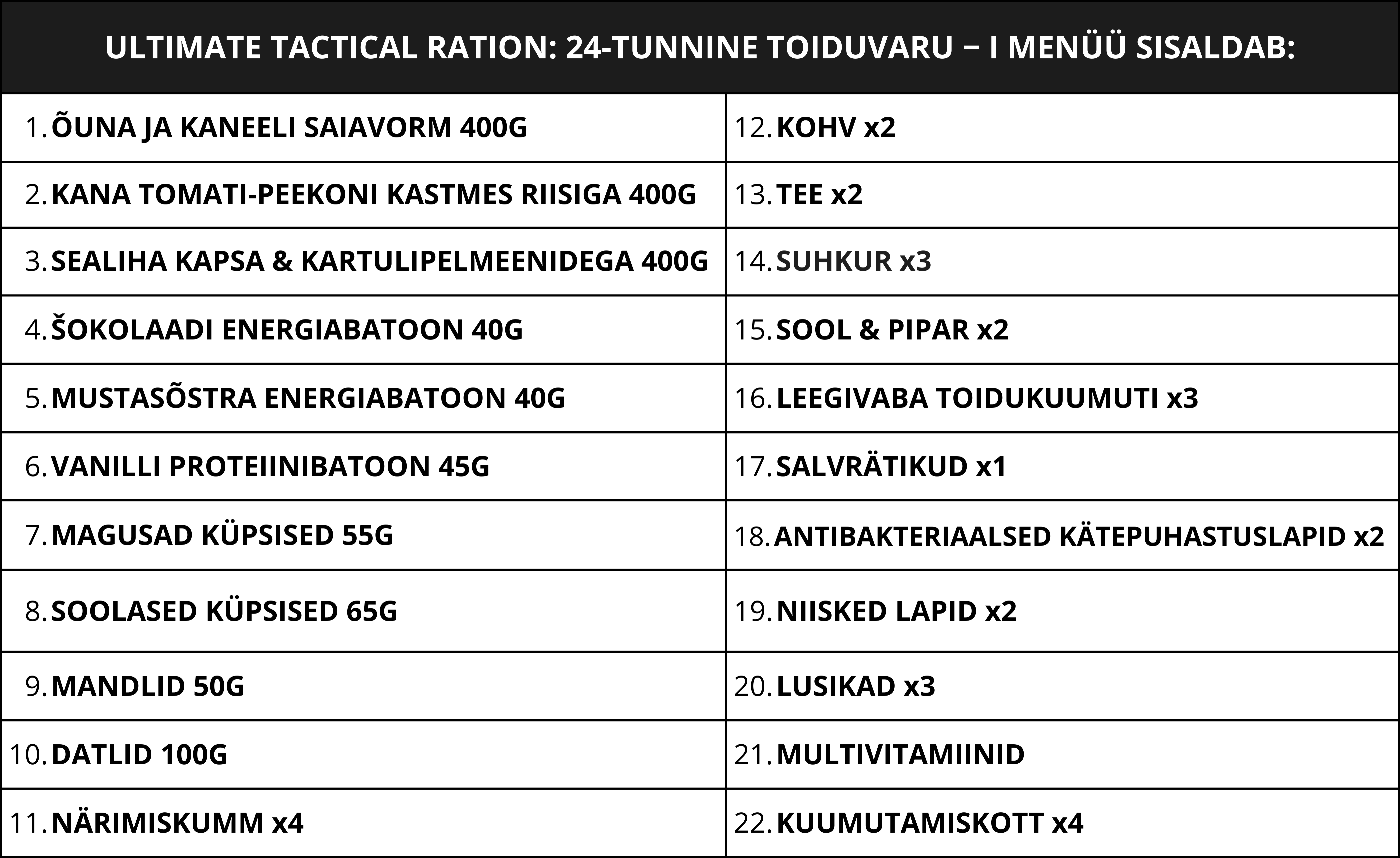 ULTIMATE TACTICAL RATION: 24-TUNNINE TOIDUVARU - MENÜÜ I